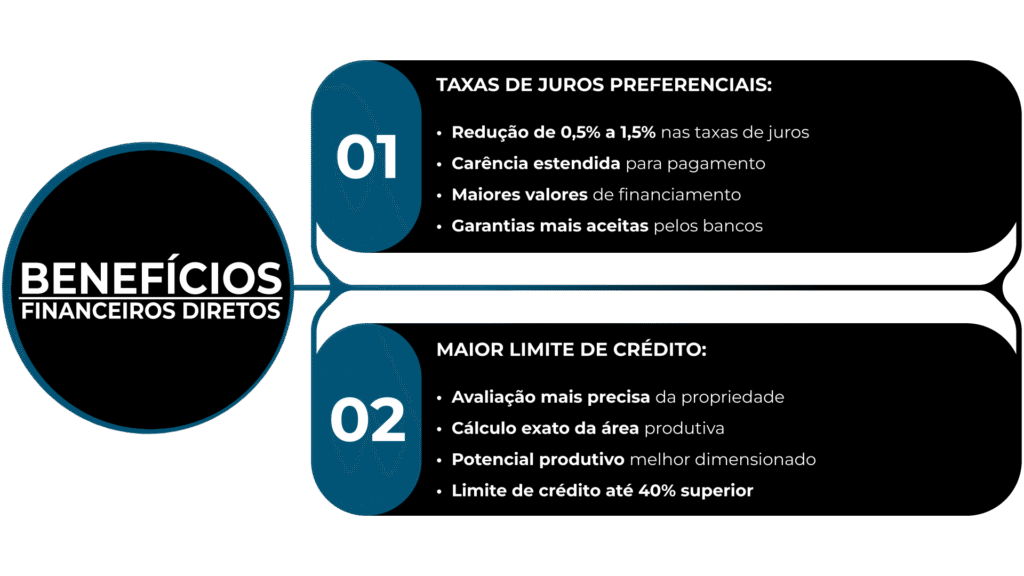 • Benefícios Tributários: A regularização da área permite correções no ITR (Imposto Territorial Rural), evitando multas e reduzindo tributos indevidos.