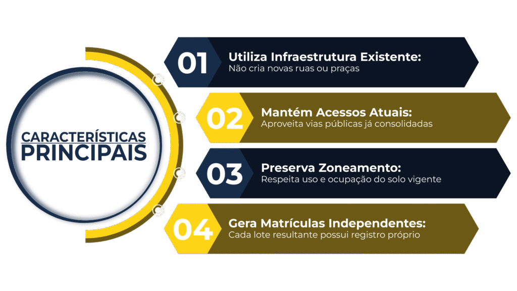 Segundo a legislação vigente, o desmembramento apresenta as seguintes características: