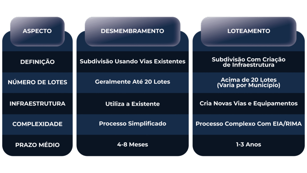 Dica Geographic: O desmembramento é mais simples e econômico que o loteamento, pois não exige criação de infraestrutura urbana. Por isso, é a modalidade preferida para divisões menores de terrenos urbanos.