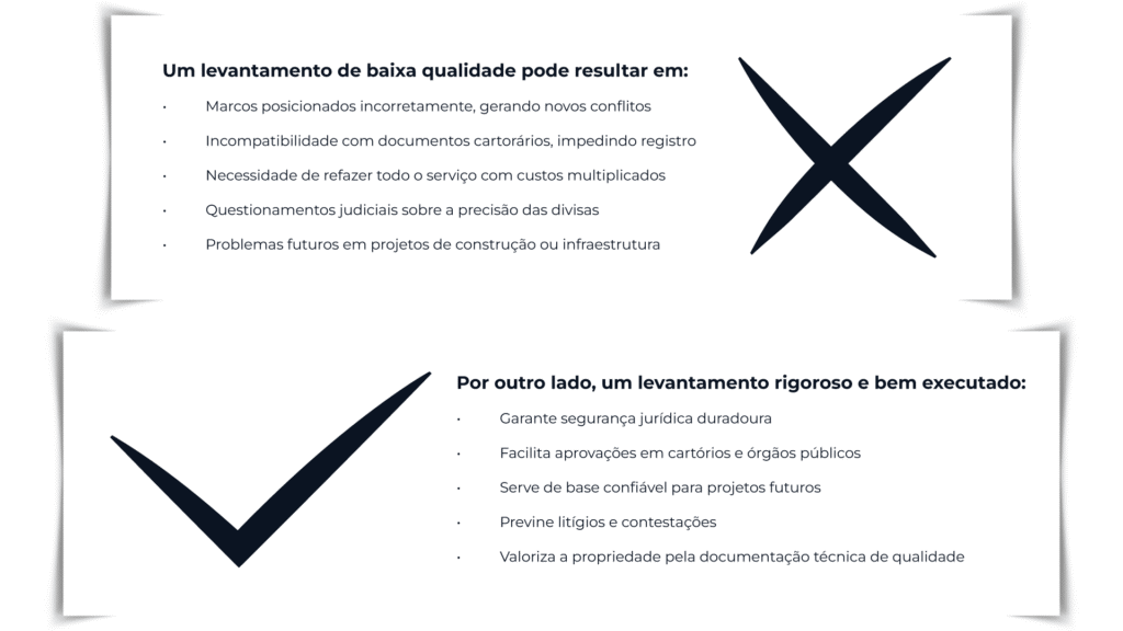 Independente da modalidade escolhida, o levantamento topográfico deve atender rigorosos padrões técnicos para garantir precisão, confiabilidade e validade jurídica dos resultados obtidos.