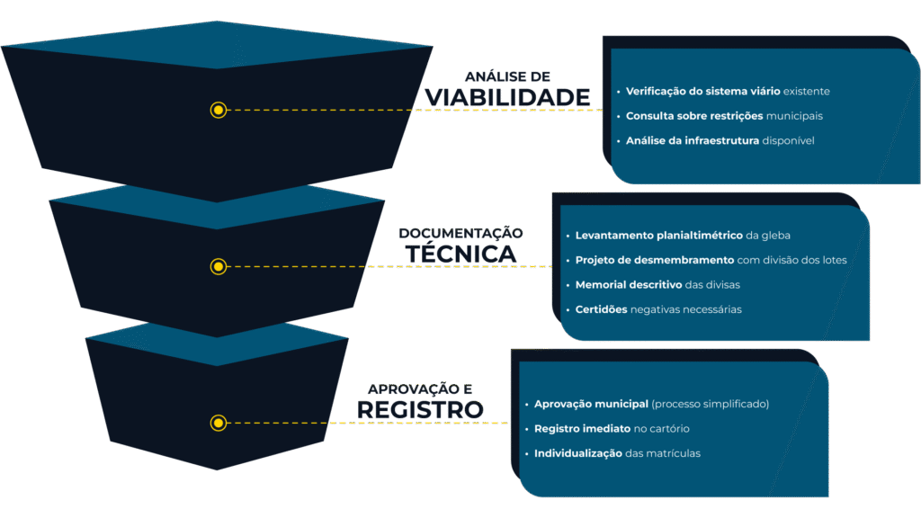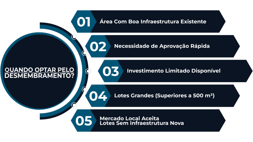 Dica Geographic: O desmembramento é ideal para glebas localizadas em áreas já urbanizadas. A economia pode chegar a 70% em relação ao loteamento, especialmente quando há infraestrutura adequada disponível. Procedimento de Aprovação