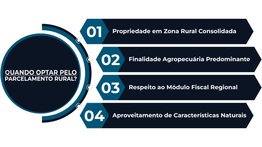 Para propriedades rurais, o parcelamento segue regras distintas estabelecidas pelo Estatuto da Terra (Lei 4.504/1964) e legislações complementares, que visam preservar a viabilidade econômica das propriedades agrícolas e evitar a fragmentação excessiva da terra.