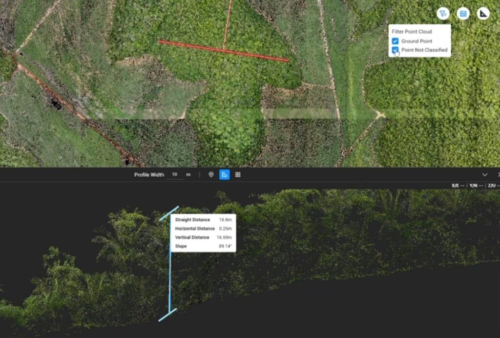 Além disso, levantamento com drone fornece “nuvem de pontos” com 50.000+ pontos de referência (versus 500 do levantamento tradicional). Isso significa que você tem modelo digital de terreno (MDT) muito mais preciso e detalhado.